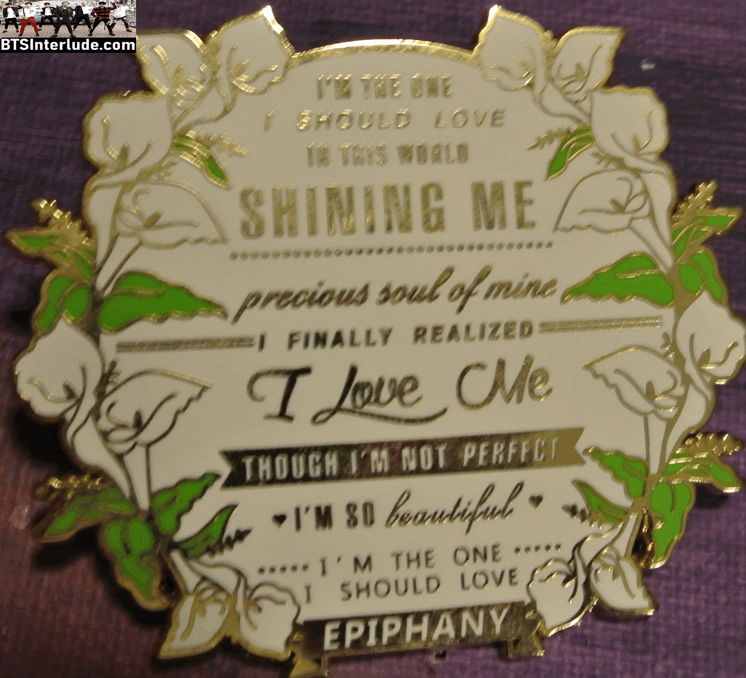This is a beautiful gold enamel pin of Jin badge...Epiphany lyrics white...from Antares pins...#286