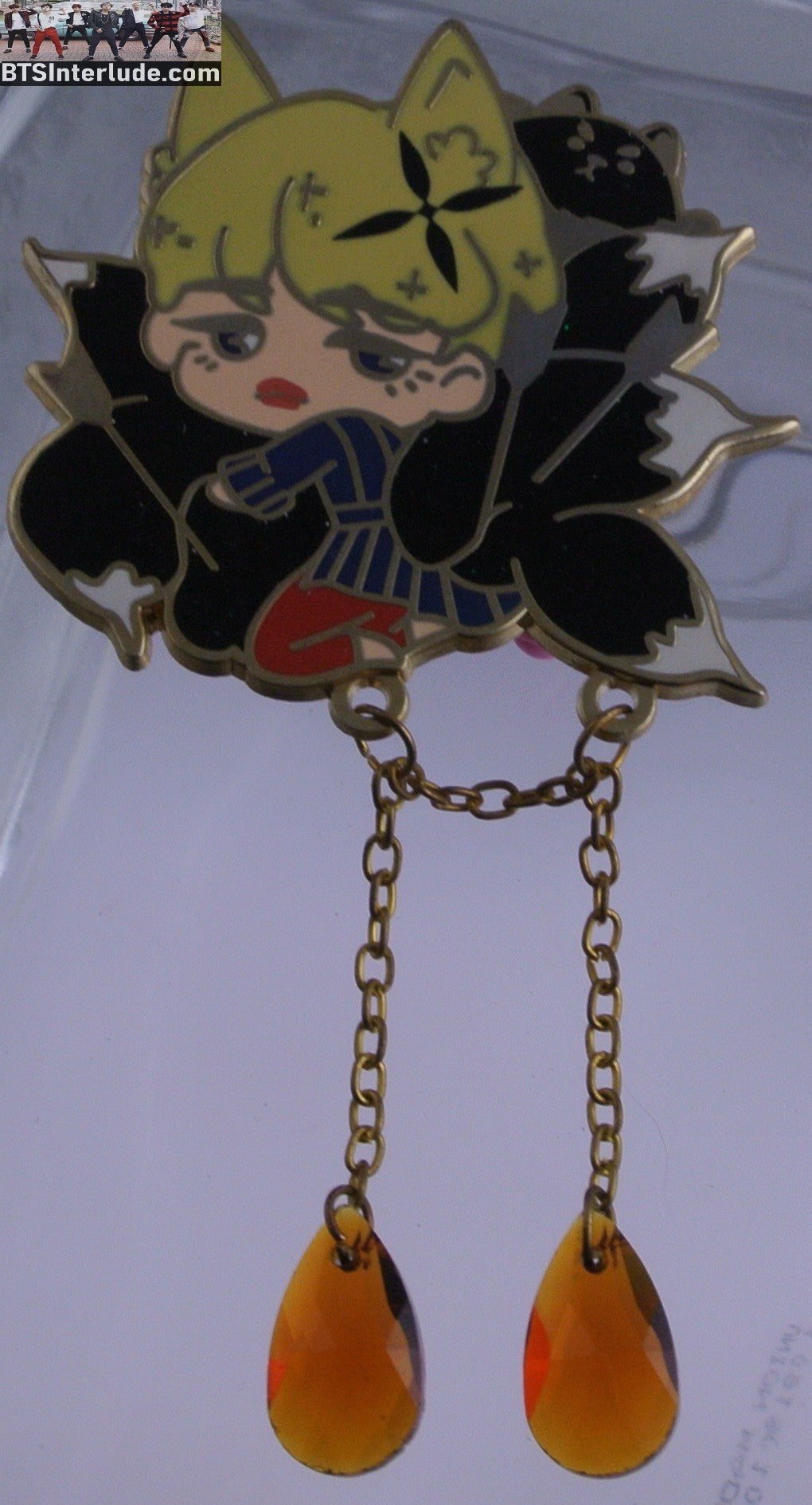 This is a beautiful gold enamel pin V badge...kitsune cat of 9 tails from Blood Sweat Tears blue robe with 2 amber crystal drops...from Kitsune x Hazepins....#4478