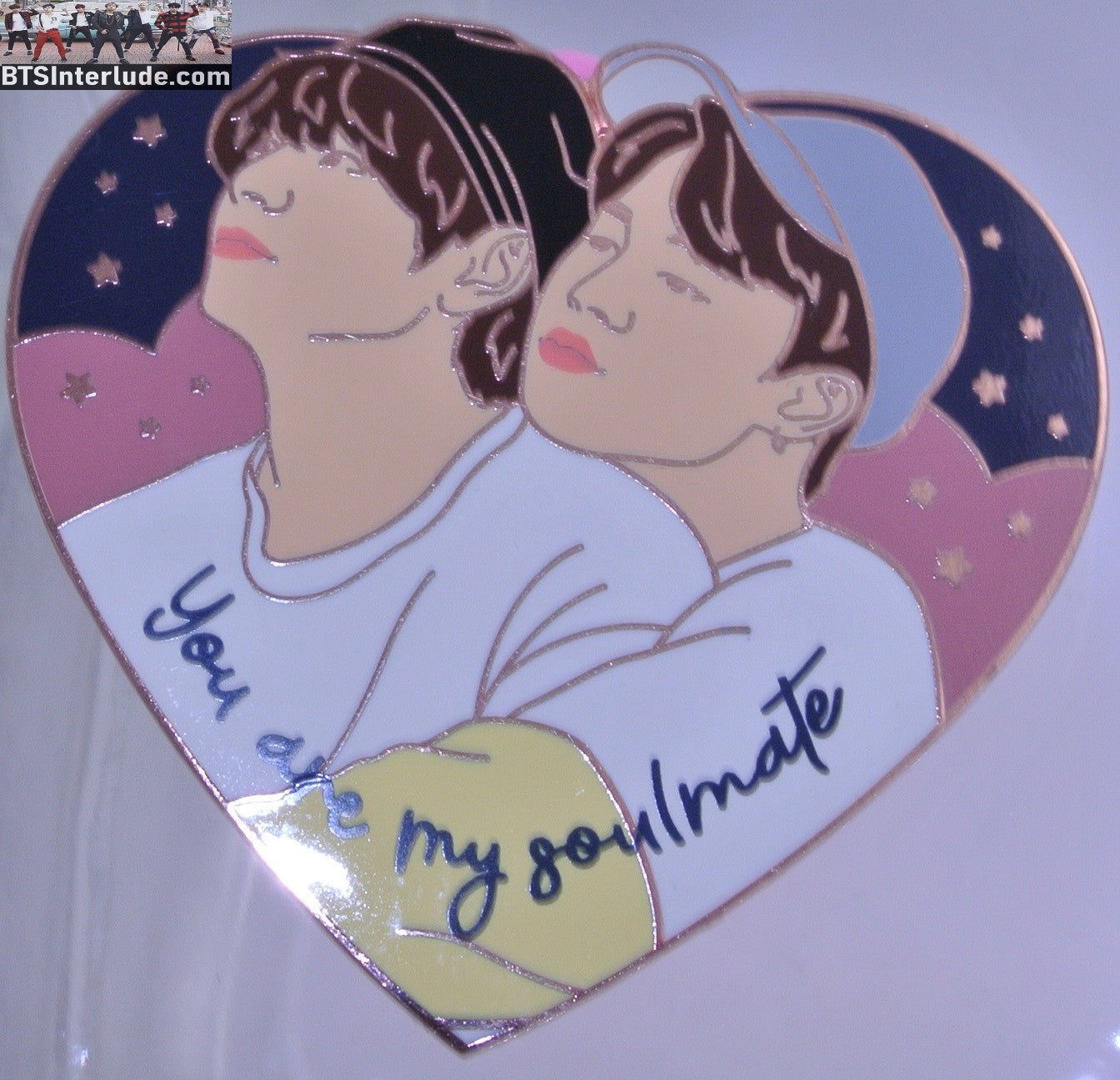 This is a beautiful rose gold copper enamel pin featuring V and Jimin..heart shaped with You are my Soulmate on the bottom...from Dal Pins...#4386