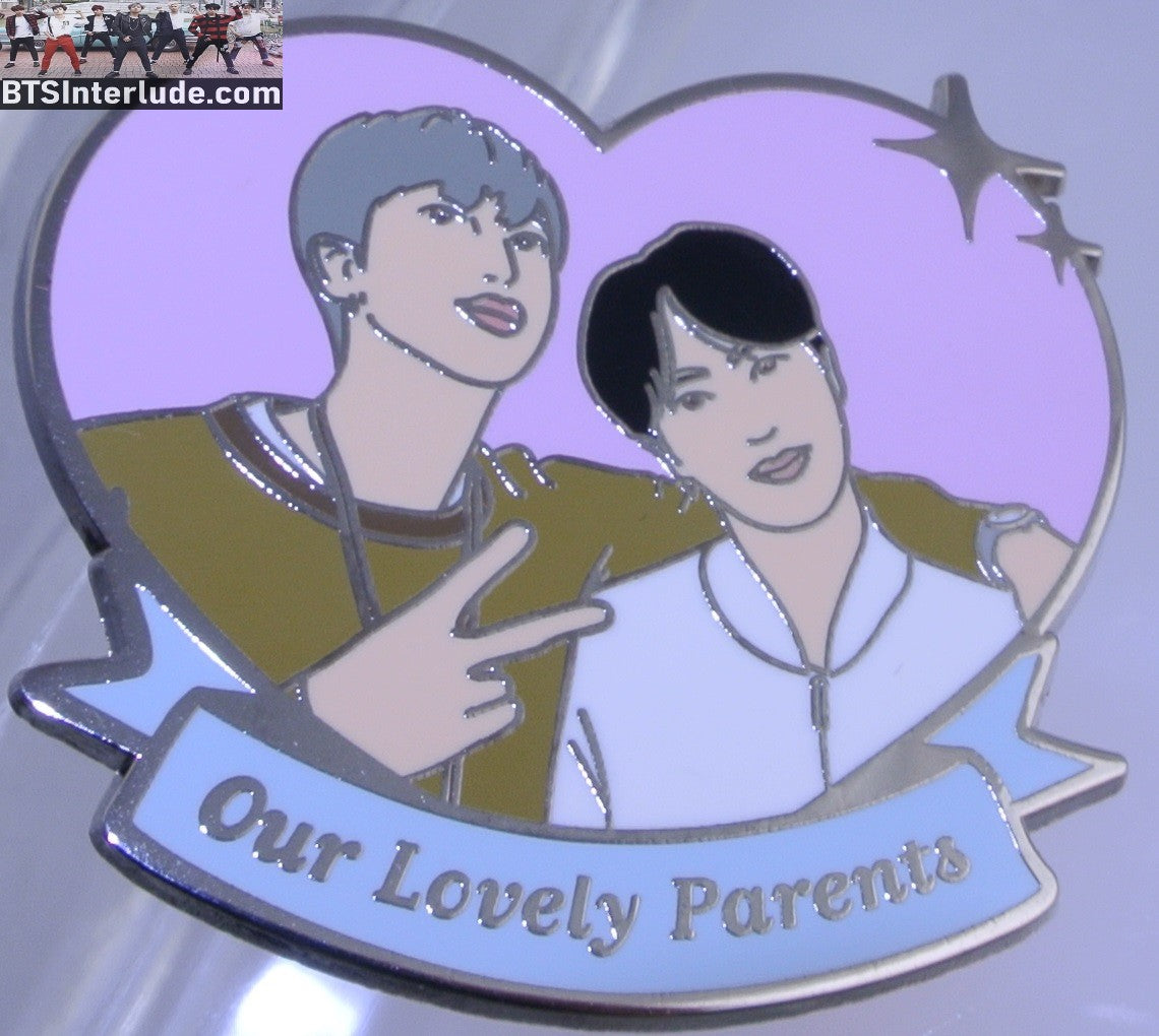 This is a beautiful silver enamel pin featuring sub-unit RM and Jin pink background heart and Our Lovely Parents at bottom...#4567