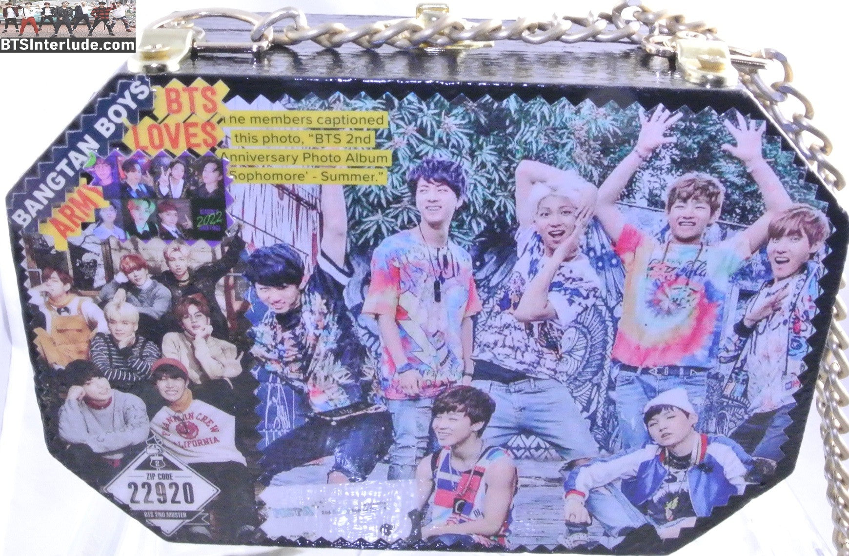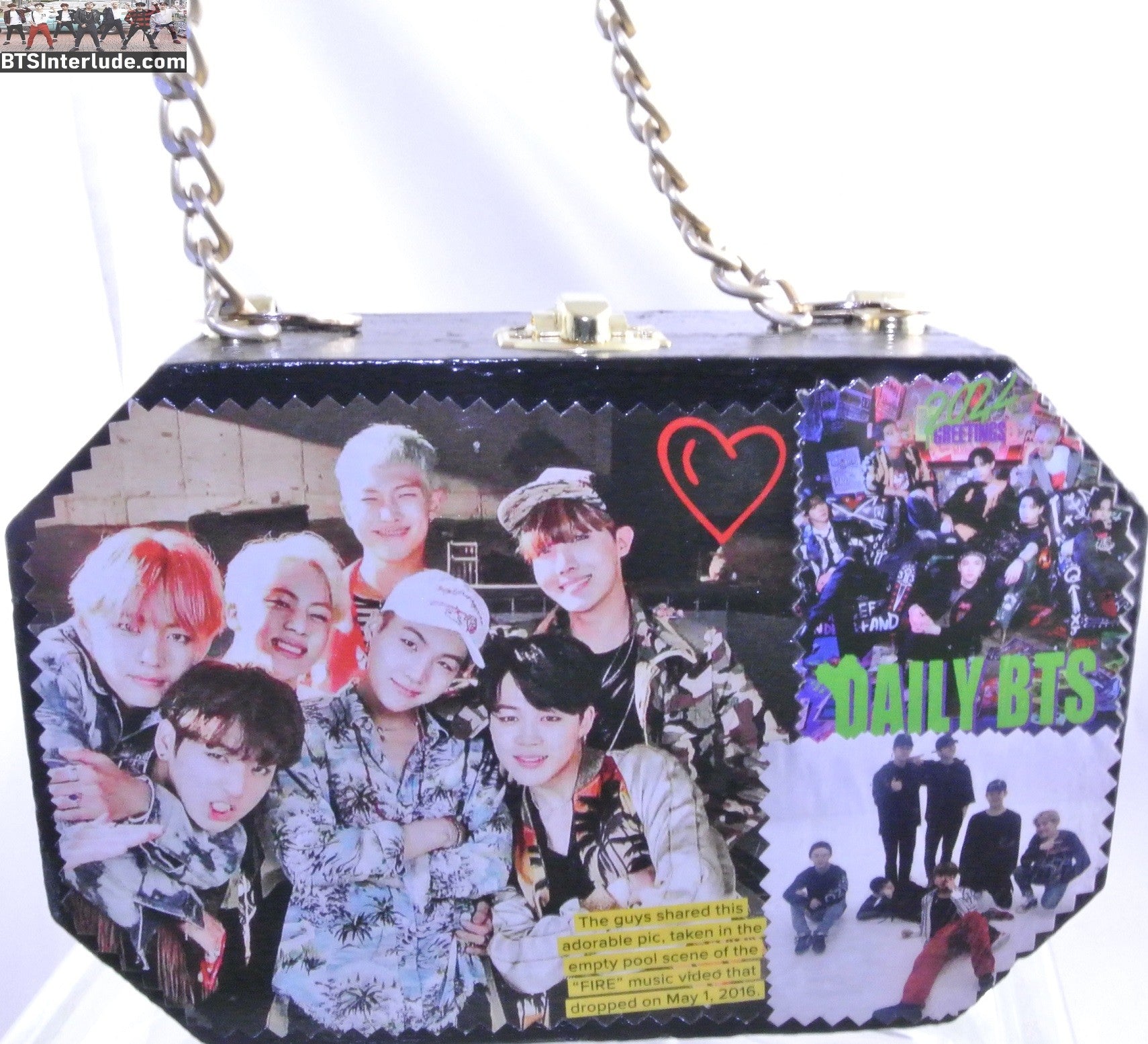 This is a black octagon cigar box purse featuring BTS group Fire and Daily BTS on one side and 2nd Muster Peace shirts on other inside has them in tuxes and DNA music video and green glitter bottom inside with gold hinges and clasp and gold chain handle...#5114