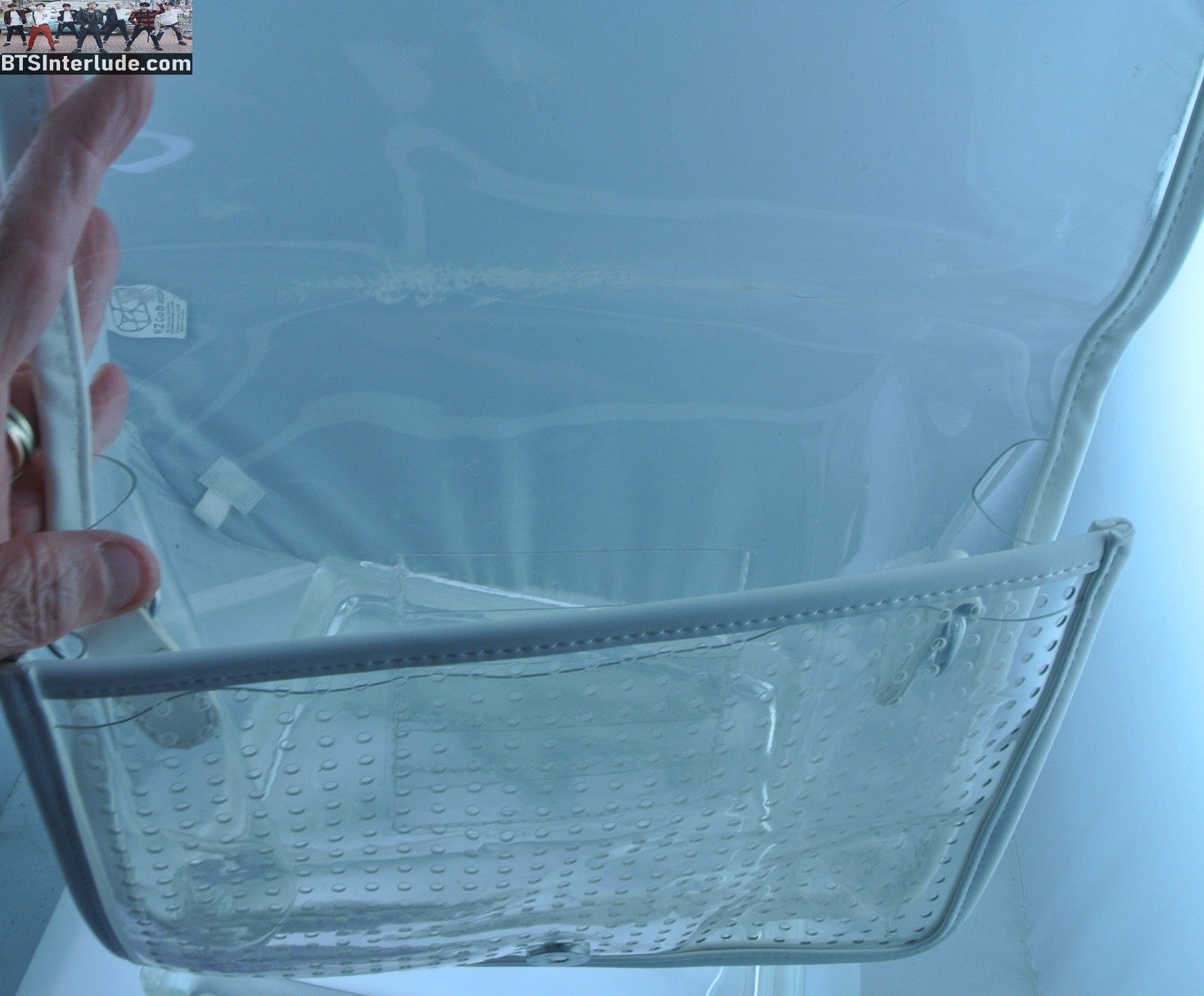 This is a cute clear ita bag purse clutch concert ready with purple white adjustable strap with BTS phrases on it....some rubbing on the fold....I really wanted this one to work out for me but unfortunately it did not....#7524